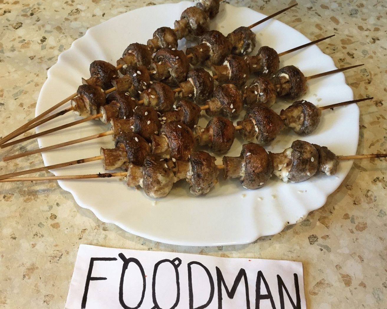 - Ponemos los champiñones en las brochetas y colocamos una bandeja para hornear para que haya espacio debajo (como se muestra en el video).