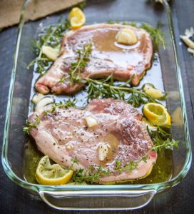 Agregue jugo de limón a la carne de cerdo, cortada en rodajas exprimidas limón, ramitas de romero, tomillo, ajo picado y mantequilla (½ tazas). Voltee los trozos, frote la marinada en la carne, cubra y enfriar durante al menos 2 horas, preferiblemente 4 horas.