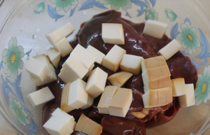 - Lavamos el hígado de pollo y lo limpiamos de películas grasas. Fusionado Cortar el queso en cubos. Es preferible tomar queso de salchicha. Conectar hígado de pollo y cubitos de queso.