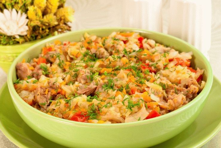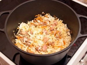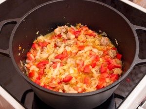 - Agregue el repollo picado, ligeramente sal, pimienta y cocine a fuego lento hasta que el repollo esté listo durante aproximadamente media hora.