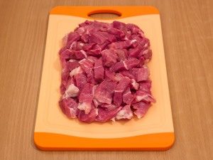 - Agregue la carne de cerdo, cortada en cubitos o en cubitos y bien alevines