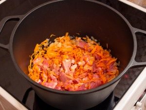 - Freír en un recipiente caliente con aceite vegetal. cebollas y zanahorias ralladas.