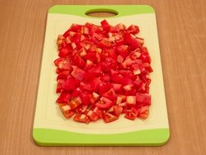 - Agregue los tomates, cortados en cubitos, oscurezca en un pequeño fuego durante quince minutos y retirar del fuego.