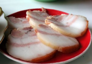 - Debemos picar las cebollas, agregarlas al tocino y encima colocamos suavemente las piezas del conejo frito.