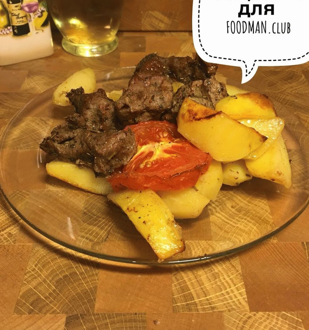 - Pon las papas en una fuente para horno, en el medio hacemos una pequeña depresión, y poner el cordero.
