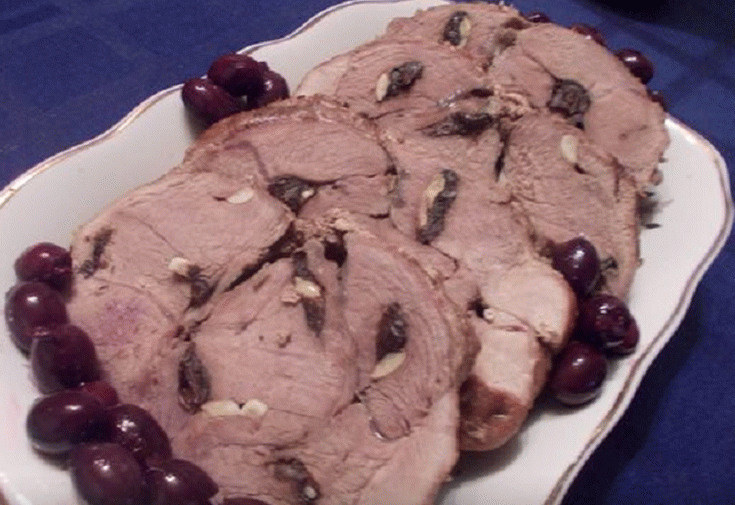 - Rellene la carne con ajo y ciruelas pasas, con sal lados, pimienta. Venda un trozo de carne con un hilo apretado.