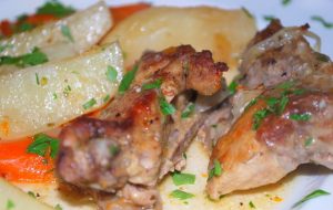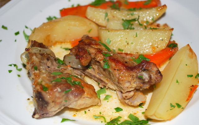 Ponga las costillas fragantes preparadas con verduras en un plato, espolvoree con perejil y sirva con vegetales frescos o salados y pan crujiente
