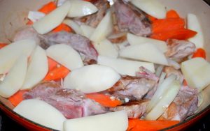 Lavamos las costillas de cerdo, las cortamos en trozos en el hueso y poner en una olla. Cebolla cortada en medio aros, zanahorias – anillos, papas peladas – en 6 partes, ajo – por la mitad.