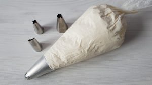 - Agregue la crema y continúe batiendo hasta que esté exuberante. masas Pon la crema terminada en una bolsa de pastelería especial con una boquilla