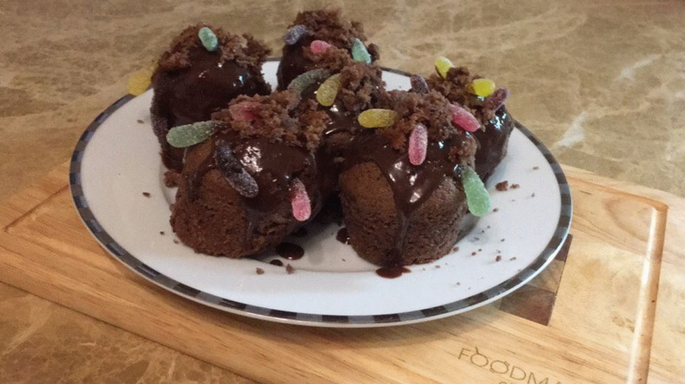 - Derrita el chocolate restante (puede agregar un poco de leche). Engrasa cada cupcake con chocolate, decora con gusanos y migajas (una bizcocho desmoronado).