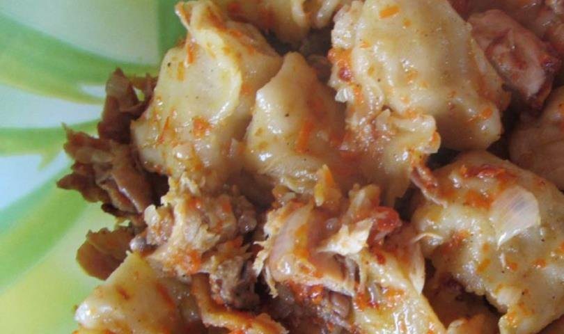 - Picar finamente las cebollas y freírlas en una sartén. Agregar pollo y algo de caldo. Guisar por 5 minutos, sal al gusto.