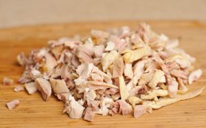 - Hervir el pollo hasta que esté tierno, retirar de la sartén, enfriar y picar finamente.