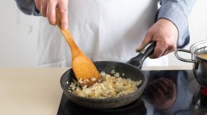 - Pica finamente la cebolla. Freír a fuego medio en aceite sobre diez minutos Agregue pimienta negra y condimento, mezcle con papas