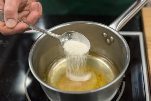 Vierte 500 ml de agua en la olla, donde debes agregar el caldo cubo Lleve el líquido a ebullición y apague el fuego. Despues Introducir gelatina en agua durante varios minutos, mezclar bien. El debe Disolver completamente.