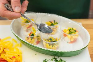 Ponga vegetales picados en una cacerola pequeña para aspic queso, y también agregue maíz. Vierte un poco los ingredientes la cantidad de amapola