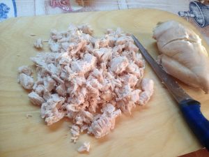 - Abra la pechuga de pollo en agua ligeramente salada, refrigere y córtalo en cubos.