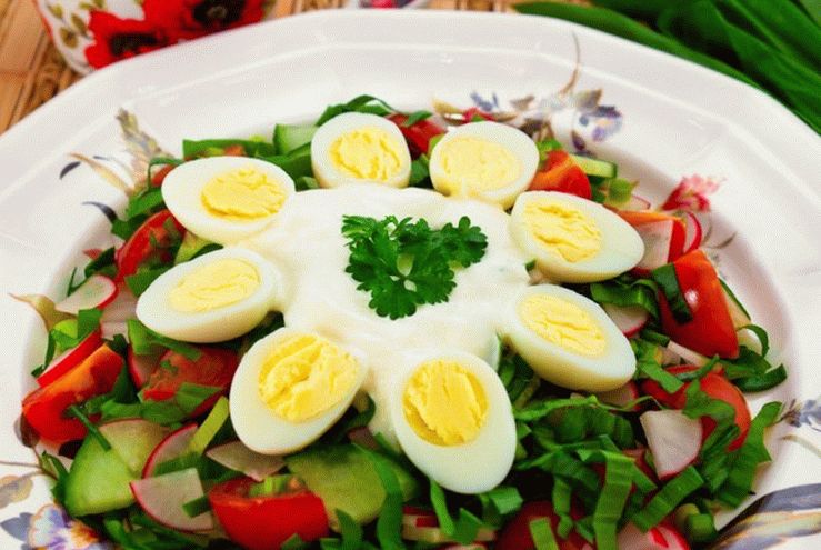 - Sirva la ensalada en un plato, ponga crema agria espesa en el centro, encierra en mitades de huevos de codorniz, adorna con verduras. Ensalada Mixta con crema agria en la mesa misma.