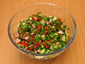- Prepare las verduras, corte la cereza en cuatro partes, pepino, rábano – En platos finos, picar la cebolla.