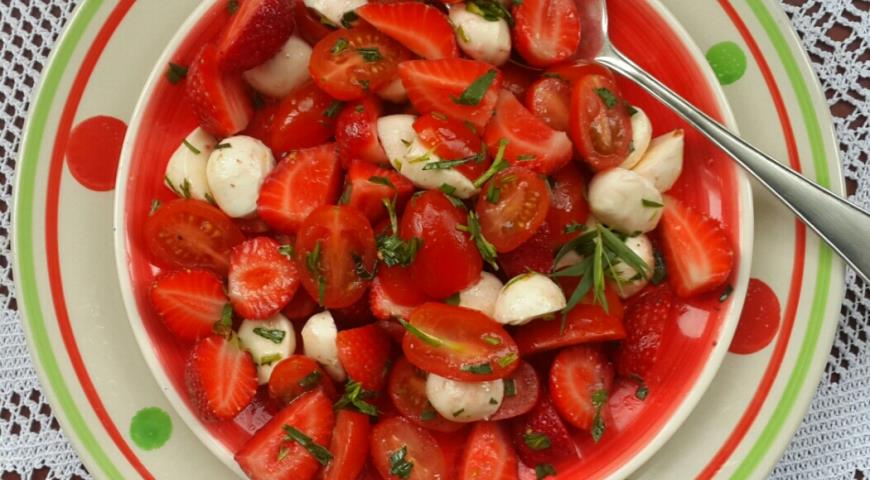 Una deliciosa ensalada con fresas y tomates cherry, que es completamente solo cocinar en casa es una brillante ensalada de verano con un agradable ternura de queso mozzarella, fresas dulces y tomates agrios Cereza Te aconsejo que hagas este plato para una merienda rápida y saludable.