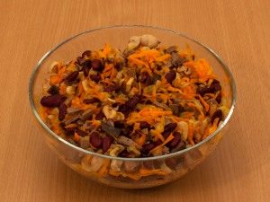 Ensalada sabrosa y muy satisfactoria. Este plato se puede preparar en casa con hígado de res o pollo (cocine el hígado de pollo después hirviendo diez minutos menos). Frijoles secos pueden ser reemplazados enlatados