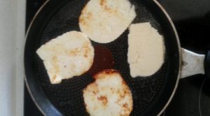 - Queso Adygea cortado en rodajas y freír por ambos lados en una sartén con aceite vegetal.