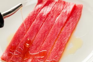 - Marinar el atún en aceite de oliva con ralladura limón, azúcar y sal.