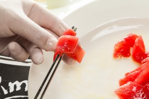 - Gira el atún en “rosetas” con pinzas y extiéndelo un plato