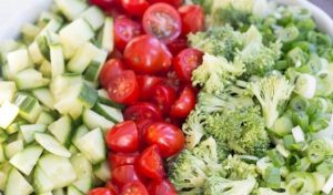 - Cortar el pepino en cubos. Reducir a la mitad los tomates. Dividimos el brócoli en inflorescencias. Cortar la cebolla en aros.