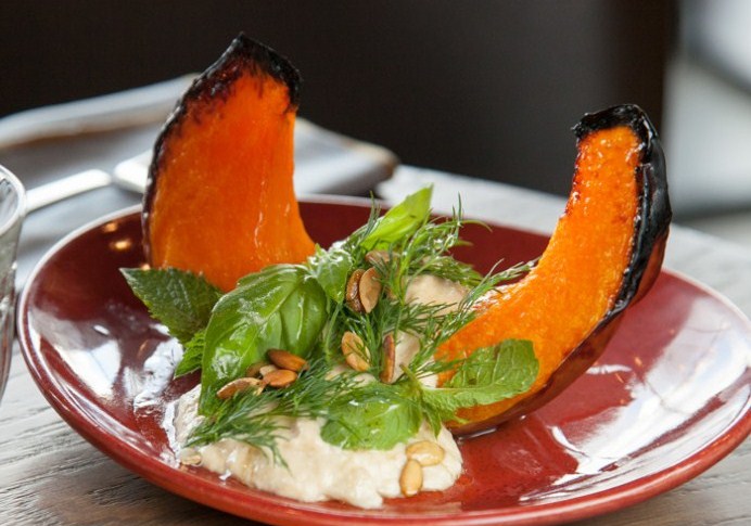 - Pon una rodaja de calabaza al horno en un plato. En una rebanada hummus con una manzana. Decorar con hierbas.