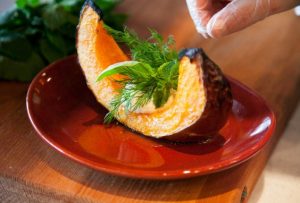 - Calabaza al horno con aceite de oliva, hierbas, pimienta y sal a una temperatura de 180-200 grados durante aproximadamente 45 minutos.