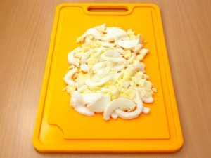 - Huevos duros, frescos, pelados, cortados en tiras.