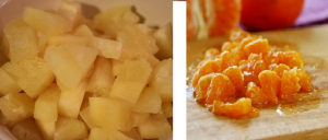 - Cortamos mandarinas y piñas en piezas arbitrarias.