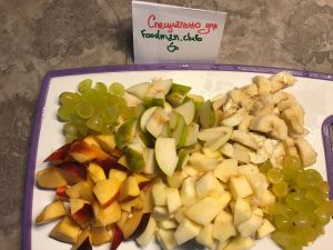 - Lave las frutas, pele la manzana y el plátano y todo cortar en rodajas medianas. Cortar las uvas por la mitad.