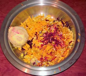 - Frotamos parte de la remolacha y la calabaza en un rallador grueso, y parte en poco profundo Frota la ralladura de la naranja en un rallador fino.