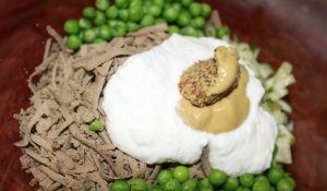- Mezcle suavemente el hígado con los guisantes en un recipiente volumétrico, pepinos, hierbas, aderezo de yogurt, mostaza.