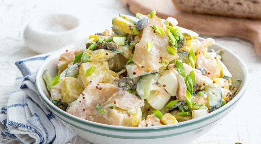 Una deliciosa y abundante ensalada de papa con pez mantequilla, que es fácil cocinar en casa, te aconsejo que lo hagas como en una mesa festiva, y para una comida regular.