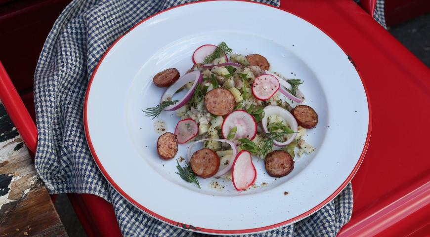 - Combinamos papas, tocino, cebollas verdes, eneldo y pepinillos. Condimentamos con la salsa resultante. Extendido en un plato hondo, decorar con rábanos, salchichas y eneldo. Para probar, agregue más pimienta negra