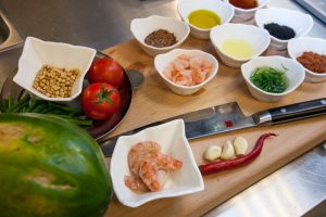- En un recipiente aparte, mezcle la pasta de Tom Yam, el jugo de lima, el pescado. salsa y aceite de oliva. Agregue ajo picado y mezclar