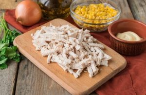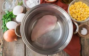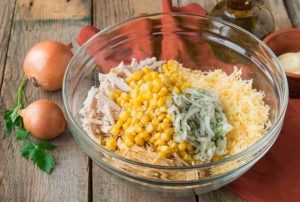 Hervir la pechuga de pollo en agua salada durante 30 minutos, enfriar. Abre el maíz y escurre.