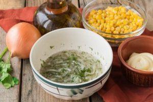 En un bol untamos la cebolla, picada en medio aros, finamente perejil picado, agregue azúcar, sal, vierta vinagre y un poco agua para cubrir la cebolla. Mezclar y dejar actuar durante 15 minutos.