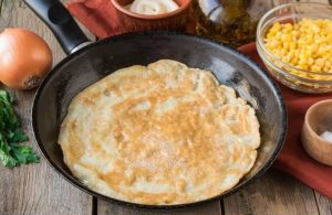 Para una tortilla en un tazón, bata los huevos con un batidor, agregue sal (1 pizca), almidón, mezclar bien, verter la mezcla en aceite y freír como un panqueque por 2 lados.