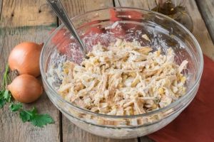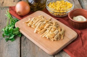 Rallar finamente el queso en un tazón, agregar la tortilla preparada, pechuga, cebolla en escabeche (exprimir un poco) y maíz.
