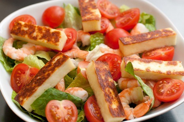 Una ensalada con queso a la parrilla, verduras y camarones es deliciosa y útil Este plato casero se ve como el mejor copias del menú del restaurante.