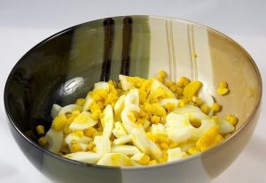 Sazone la ensalada con mayonesa y hierbas finamente picadas.
