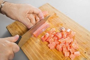 - Corte el filete de salmón de la piel y retire el hueso. Picar en cubos pequeños y transferir a un recipiente hondo.