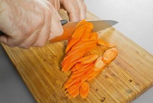 - Pelar las zanahorias, cortarlas en rodajas finas y redondas. Transfiere a un tazón.