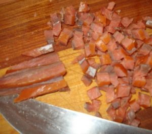 Salmón rosado ahumado para deshacerse de los huesos y cortarlos en pequeños. piezas
