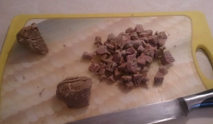 - Cortamos la ternera hervida en un cubo.