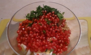 - Combinamos todos los ingredientes en un tazón, les agregamos los granos granada, ensalada de temporada.