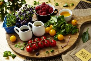 - Lave los tomates cherry y córtelos en dos mitades. Frambuesas tambien lavar y cortar en mitades.